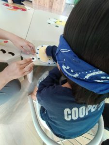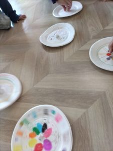 折り目を付けた紙皿に絵を描いてコマを作りました♪