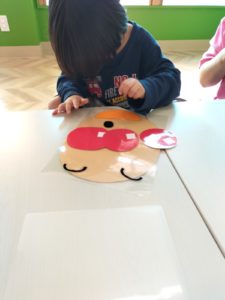 目を開けた状態でパーツを確認した後、目隠しをして挑戦!
