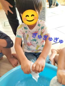 まずは雑巾の絞り方の練習をします!!