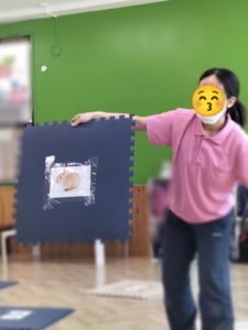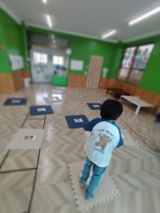 そして、動画の視聴が終わった後は、スタッフが言った動物のイラストの上にジャンプをする課題に取り組みました。