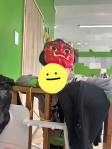スタッフさんの背中に貼った鬼のイラストに