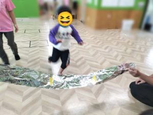 アルミホイルのゴールテープを切ってゴール✨