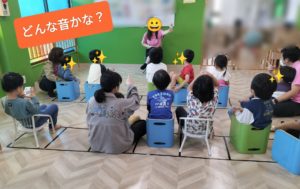 まずはスタッフが出すカードを見て、動物の鳴き声やどんな音がするのかをみんなで考え声に出してみます!